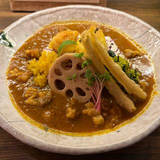 tomo51スパイスのとっても効いているカレーです。 大根の酢漬け(?)豆の甘煮・蒟蒻の煮物・ヨーグルトが小鉢で添えられていました。 カレーは2種類(甘口・中辛・辛口とカレーの種類によって異なります)から選べて、ライスもサフランライス・雑穀米から選べました。 私は雑穀米が好みだから雑穀米にしましたが、カレーに合うように水分調整がされていてサラサラのカレーにとてもよく合いました。