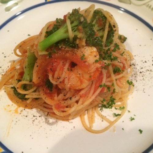 赤エビとブロッコリーをトマトソースで